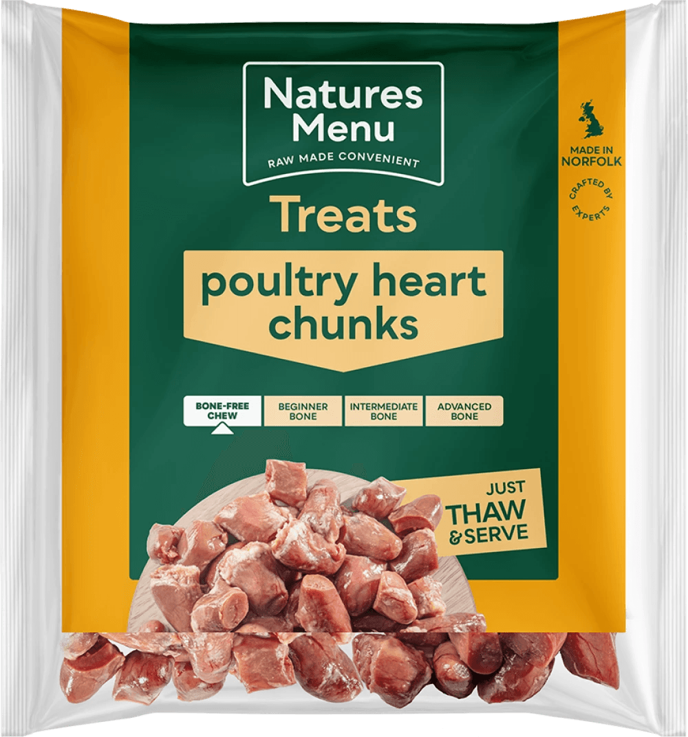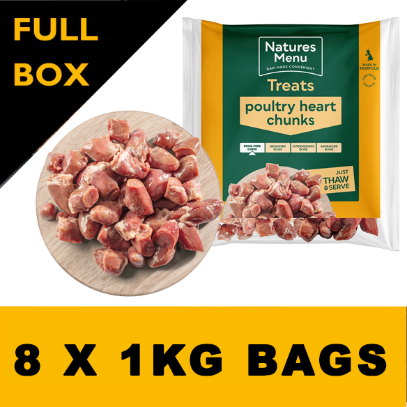 Our delicious, nutritious and juicy poultry heart chunks can be served as a tasty snack or as the meat component in homemade raw meals. We advise that heart makes up no more than 5-10% of the total daily ration of food and is fed no more than 2-3 times per week. Bone free. Suitable for dogs fed a raw diet over 8-10 weeks of age. Pack size 1 kg.