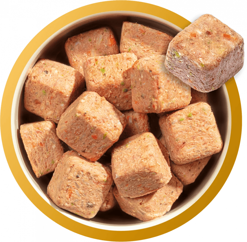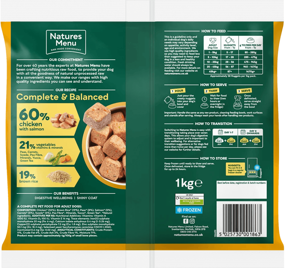Wholesome and meaty raw nuggets made with chicken and salmon dog food. A healthy complete and nutritionally balanced raw meal for dogs. Pack size 1kg
