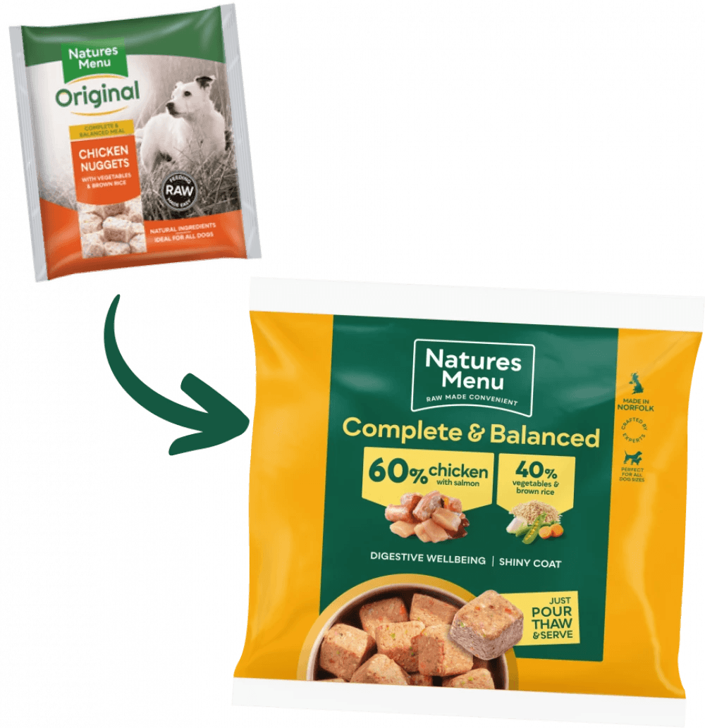 Our raw, freshly frozen chicken nuggets for dogs are simple to serve, and with parboiled brown rice mixed in, provide your dog with an easy to digest, non-starchy carbohydrate, rich in minerals and vitamin B. They provide your dog with everything they need and nothing they don’t, as we only ever use quality, responsibly sourced, human grade meat in our recipes, all of which are made to FEDIAF guidelines and approved by our trusted experts.