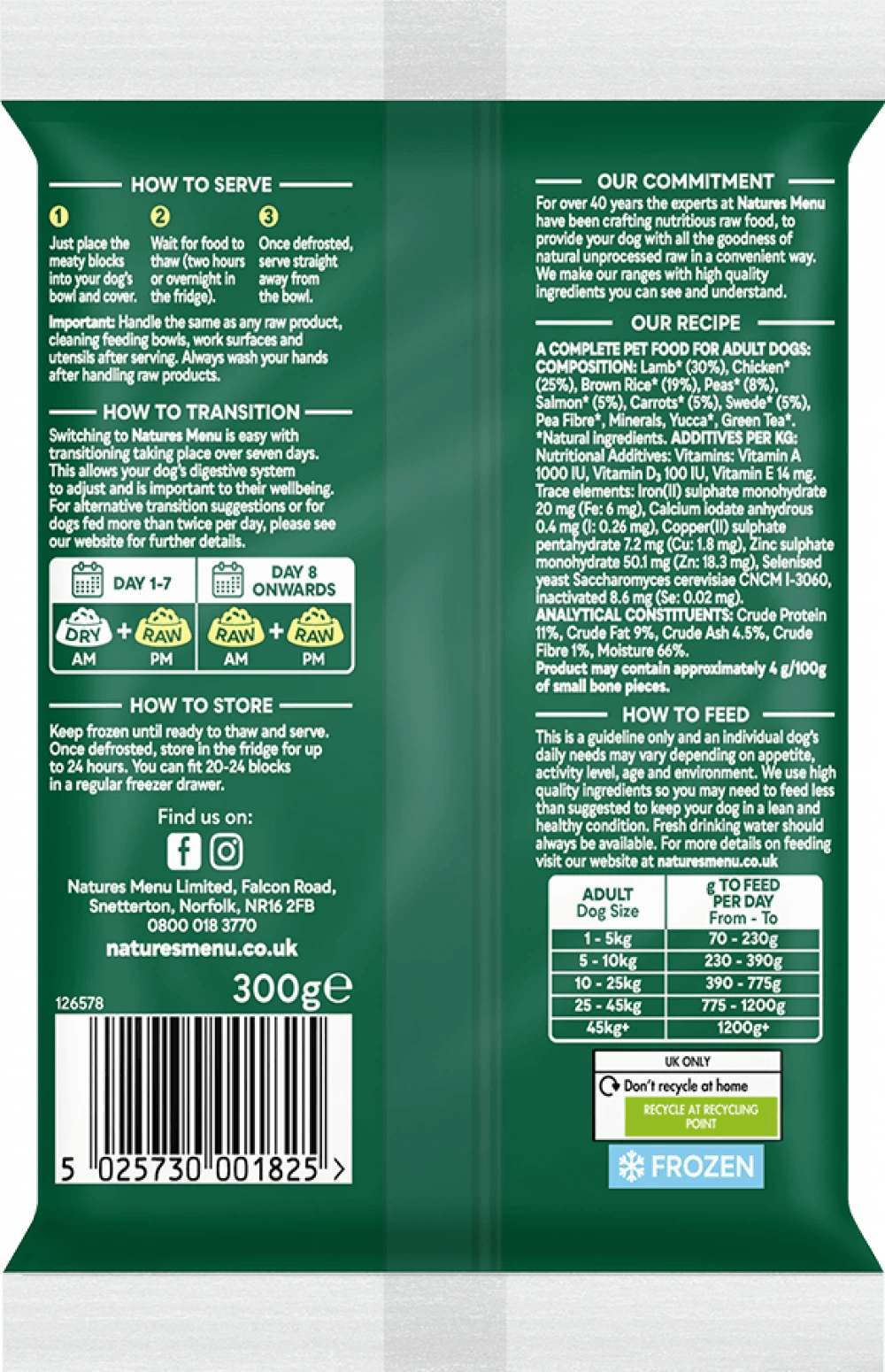 Simply work out the number of blocks needed, thaw and serve, for a dinner your dog will tuck into with glee. As we use no artificial colours or preservatives, you may notice some small variations in colour and appearance between batches of nuggets; this is to be expected and perfectly natural. This frozen raw dog food may contain small pieces of bone (4g per 100g) and is suitable for all adult dogs.