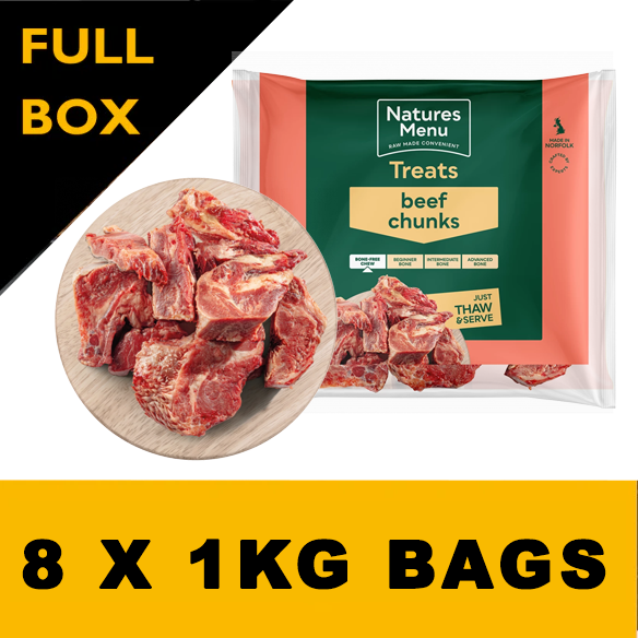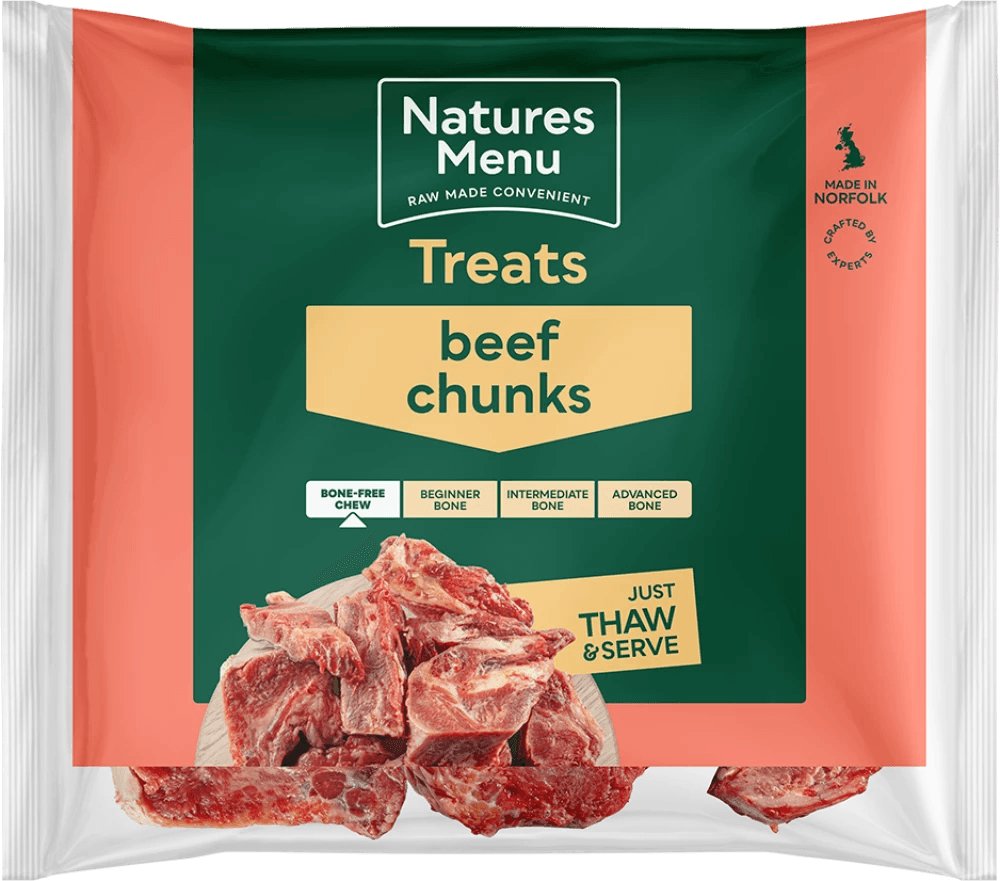 The ultimate chewing meat and an ideal starter chew for beginners. Our delicious raw Beef Chunks are packed full of natural nutrients and can be served as a tasty snack or as the meat component in homemade raw meals. Bone free. Suitable for dogs fed a raw diet over 8-10 weeks of age. Pack size 1kg.