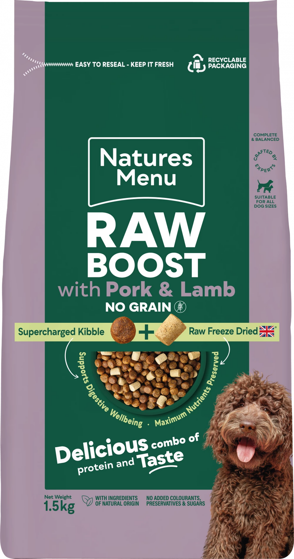 The best of both worlds in every bite! Our new Raw Boost with Pork & Lamb are a delicious combo of raw freeze dried bites packed with high-quality protein, together with crunchy kibble supercharged with prebiotics, vitamins and minerals to support your dog’s wellbeing and vitality. Suitable for sensitive digestion, made with no grain.