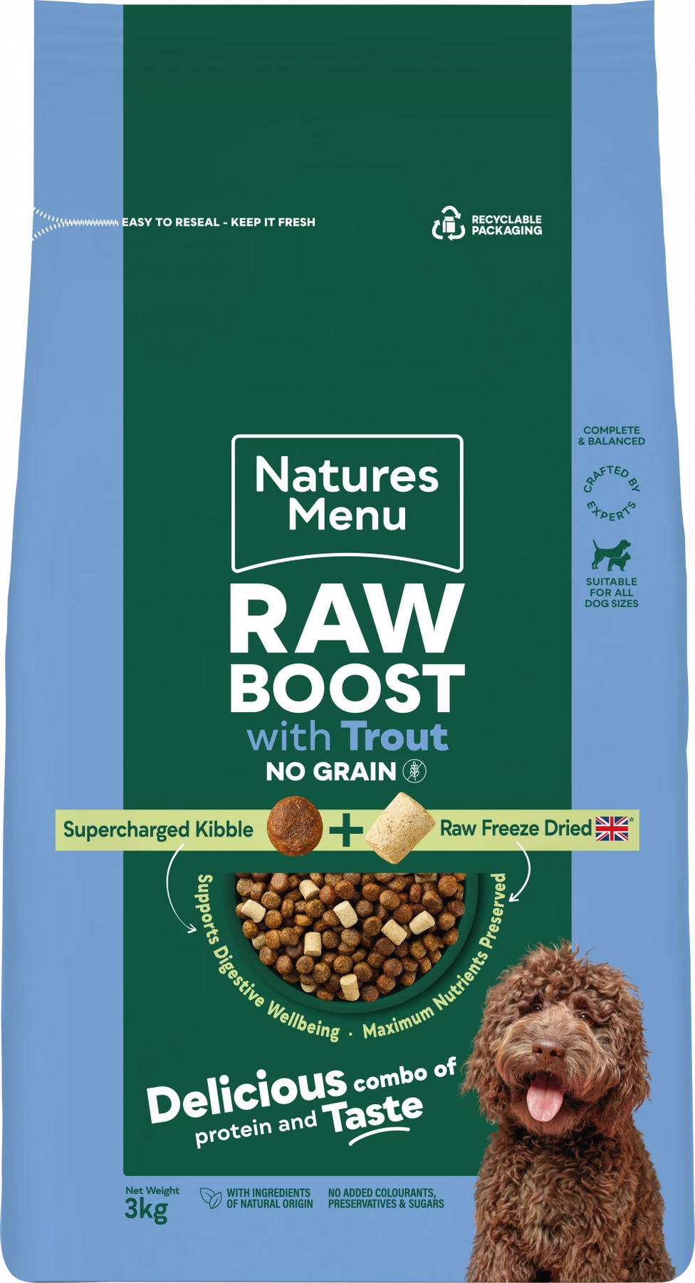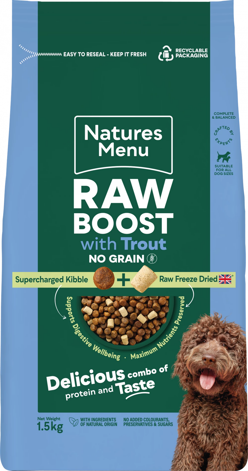 Catch of the day! Serve your dog our new Raw Boost recipe made with high-quality trout and natural ingredients. No added colours, preservatives, sugars or grain. Our experts have created this new recipe to offer you all the convenience of feeding a protein-packed winning combo of raw freeze dried bites and highly-nutritious kibble.