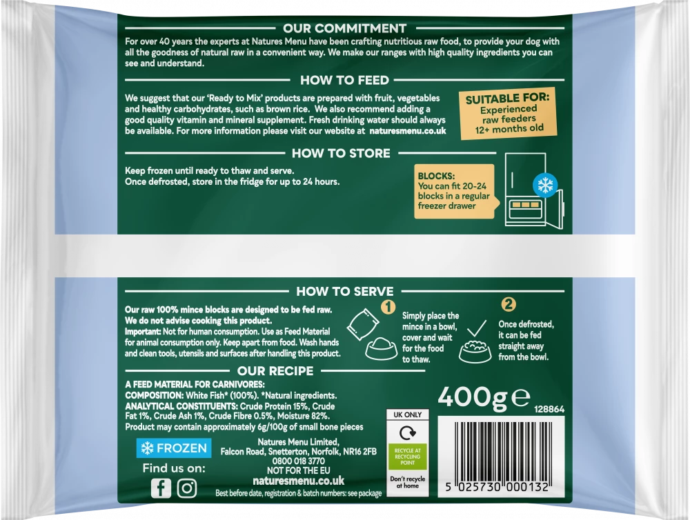 Just White Fish Raw Mince is an ingredient or treat, not a complete meal. Add it to other ingredients to make balanced and nutritious raw meals at home.