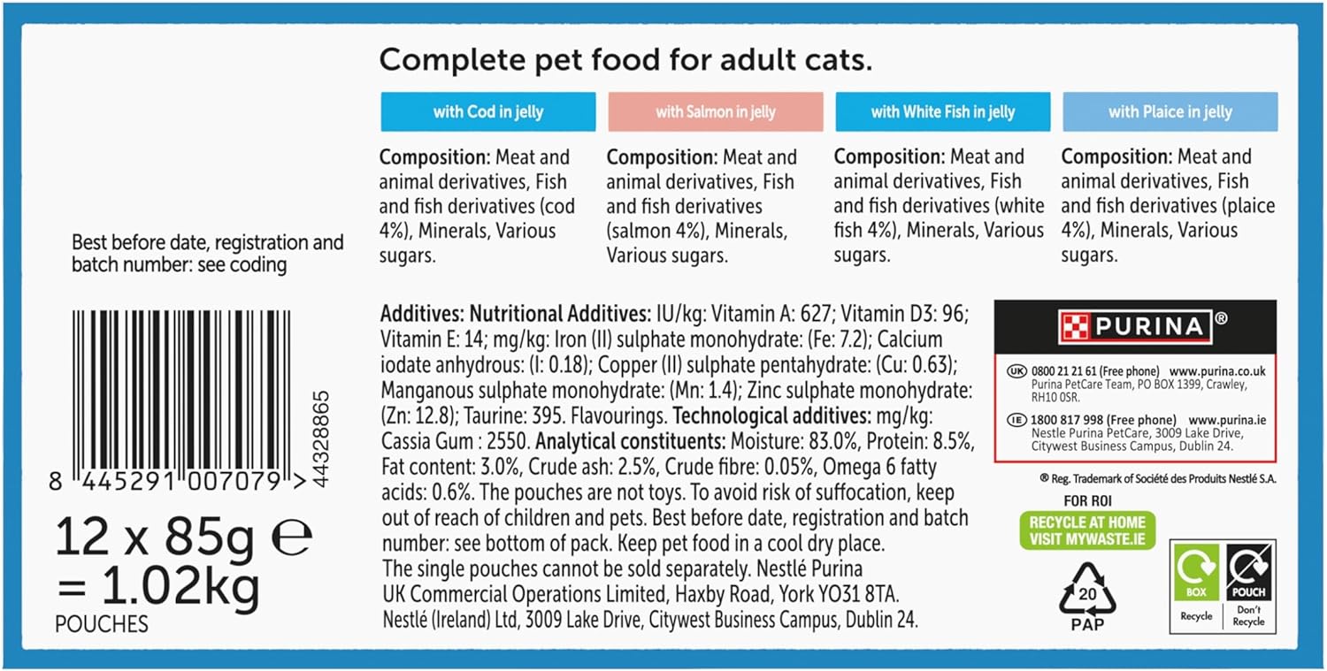 For an average adult cat (4kg), feed 4 pouches per day in at least 2 separate meals. The adult maintenance averages are based on moderately active cats at normal environmental temperatures. Individual needs vary and feeding should be adjusted as required to maintain your cat at a lean, healthy body weight. Serve at room temperature. Clean, fresh drinking water should always be available.