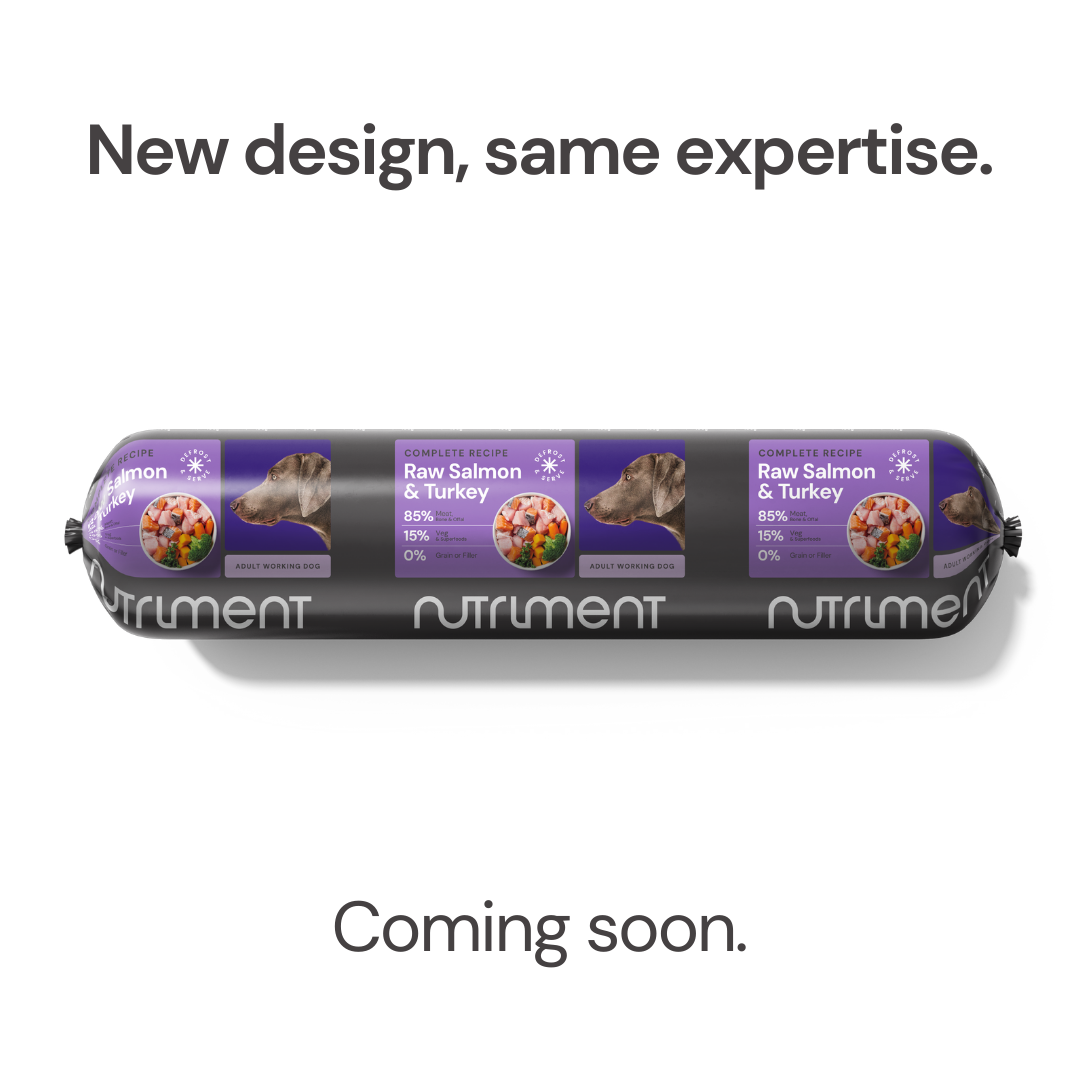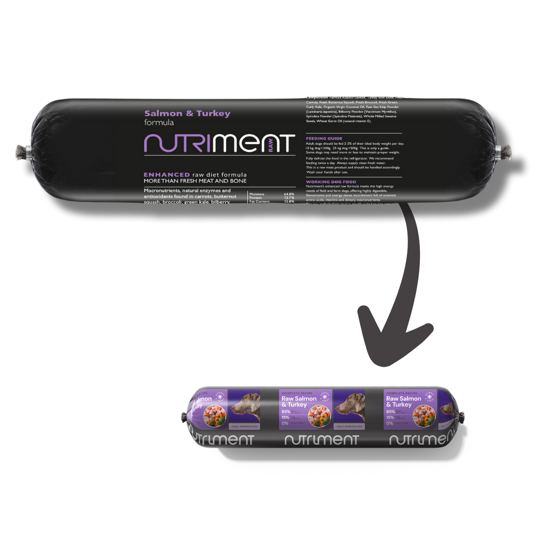 Nutriment's salmon and turkey formula is packed full of protein, essential fatty acids and other nutrients which are vital for a healthy and happy dog. Fish is an important part of any complete, biologically appropriate diet for dogs, and our responsibly sourced salmon is a great option for adding variety to your dog's diet. Formulated by our in-house canine nutritionists, our salmon formula contains carefully selected, biologically appropriate ingredients, which are free from grains, fillers and additives which can disrupt a dog's digestive system. This great-tasting recipe will be thoroughly enjoyed by your dog, and their digestive, skin, coat, heart and brain health will be promoted due to the nutritional profile of the natural ingredients.