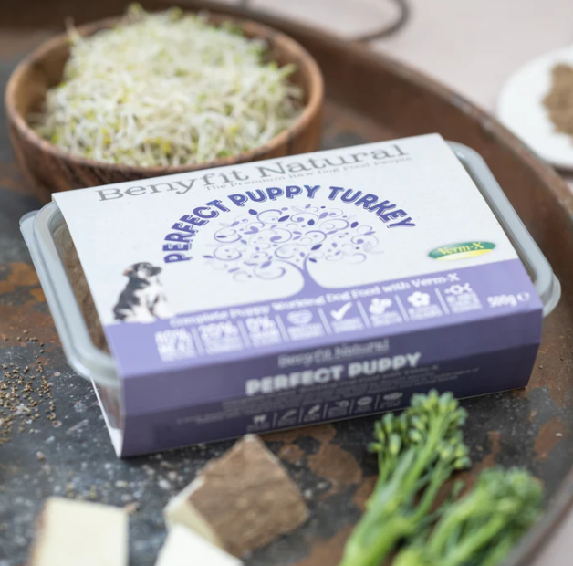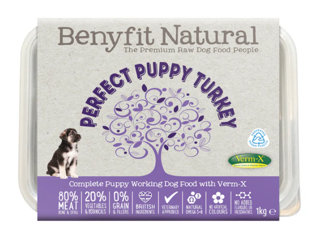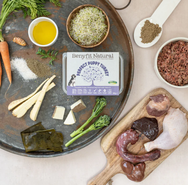 Premium raw dog food lovingly prepared by Benyfit Natural. A truly satisfying and healthy meal to ensure your very best friend gets all the nutrients they need to grow into a happy, healthy dog. Results in visible signs of healthy skin, teeth and gums, glossy coat, better digestion and strong bones.