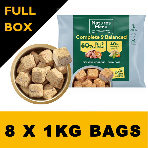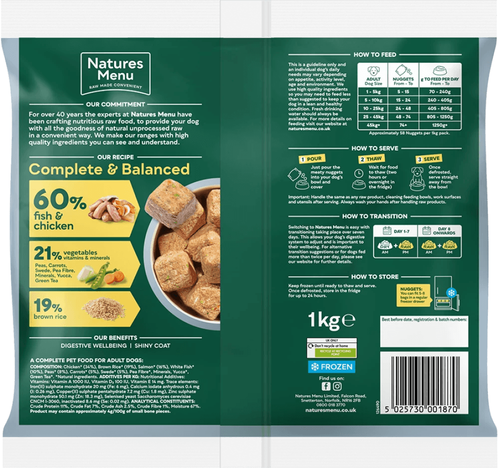 Our meaty nuggets chicken and fish dog food nuggets are complete and balanced and super tasty. Pack size 1kg