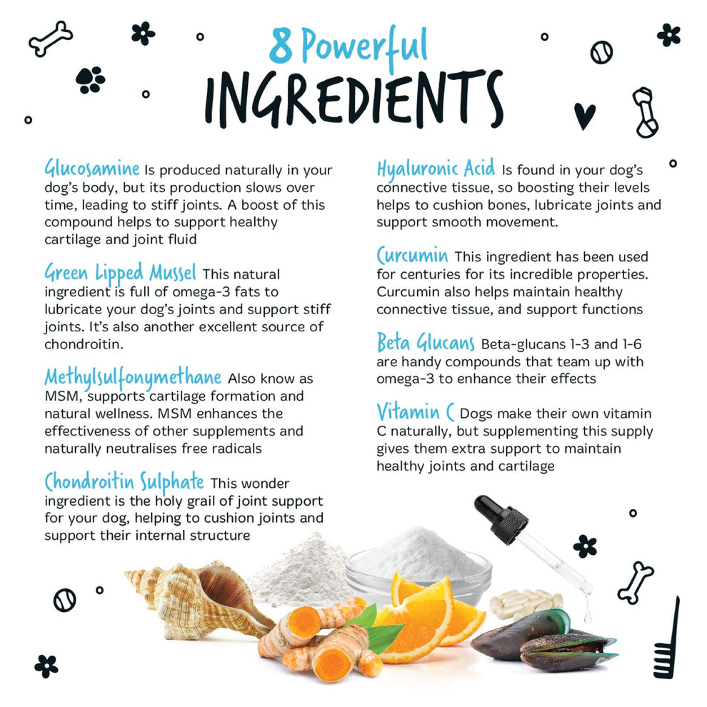 Hyaluronic Acid – Found in your dog’s connective tissue, so boosting their levels helps to cushion joints and support smooth movement.