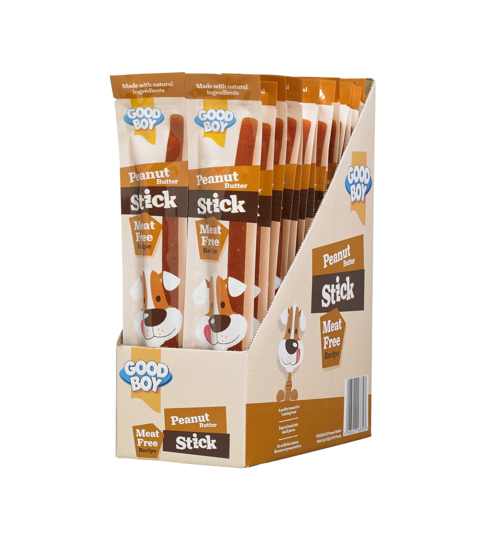 Good Boy Stick Peanut Butter Dog Treats. This super tasty Peanut Butter Stick is the perfect training treat or reward for dogs of all shapes and sizes. Gently oven baked for a soft chewy texture, this super tasty stick can be used to entice even the naughtiest of doggos to behave! Made with peanut butter - a completely meat free recipe! Smaller portions, giving you the perfect bite size reward or training treats. Made with natural ingredients. No added sugar and no artificial colours, flavours or preservatives.