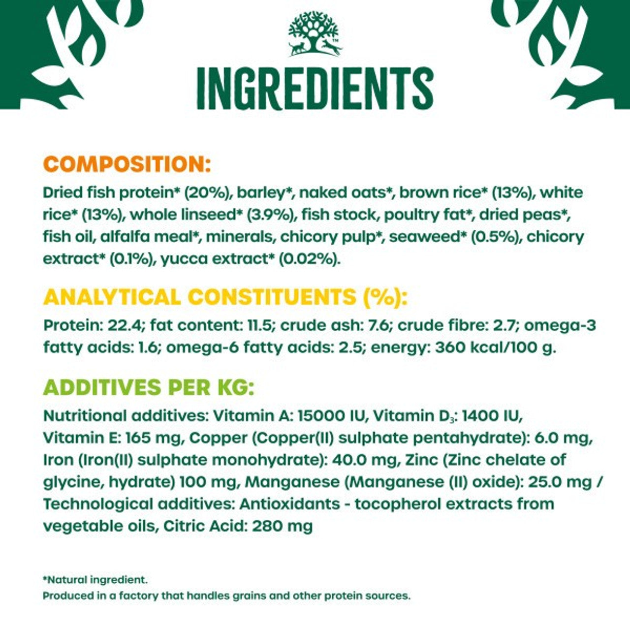 Composition: dried fish protein* (20%), barley*, naked oats*, brown rice* (13%), white rice* (13%), whole linseed* (3.9%), fish stock, poultry fat*, dried peas*, fish oil, alfalfa meal*, minerals, chicory pulp*, seaweed* (0.5%), chicory extract* (0.1%), yucca extract* (0.02%). *Natural ingredient.