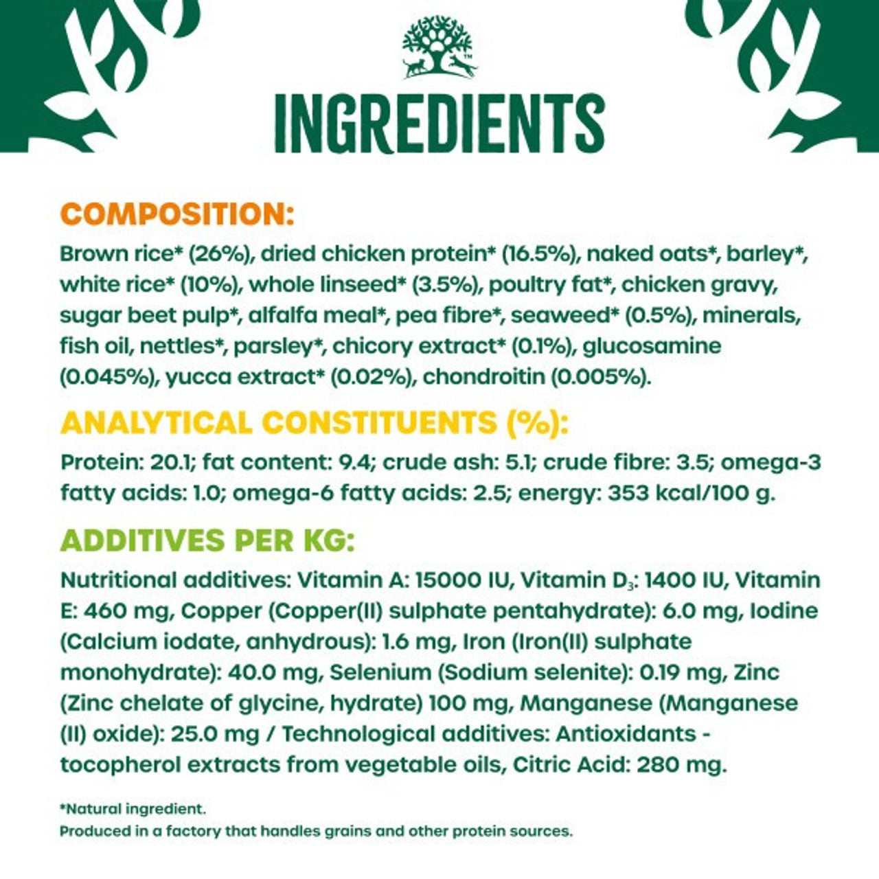 Composition: brown rice* (26%), dried chicken protein* (16.5%), naked oats*, barley*, white rice* (10%), whole linseed* (3.5%), poultry fat*, chicken gravy, sugar beet pulp*, alfalfa meal*, pea fibre*, seaweed* (0.5%), minerals, fish oil, nettles*, parsley*, chicory extract* (0.1%), glucosamine (0.045%), yucca extract* (0.02%), chondroitin (0.005%). *Natural ingredient.Produced in a factory that handles grains and other protein sources.