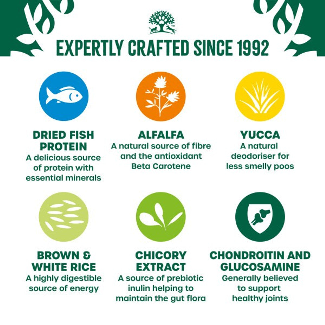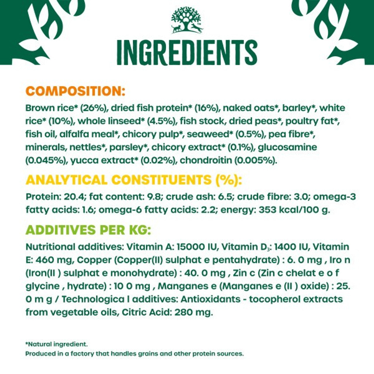 Composition: brown rice* (26%), dried fish protein* (16%), naked oats*, barley*, white rice* (10%), whole linseed* (4.5%), fish stock, dried peas*, poultry fat*, fish oil, alfalfa meal*, chicory pulp*, seaweed* (0.5%), pea fibre*, minerals, nettles*, parsley*, chicory extract* (0.1%), glucosamine (0.045%), yucca extract* (0.02%), chondroitin (0.005%). *Natural ingredient.