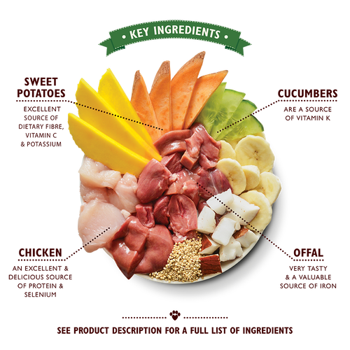 60% Fresh Chicken, Sweet Potato (4%),Quinoa, Mango (2%), Cucumber, Banana, Coconut (1%), Minerals, Turmeric (0.1%)