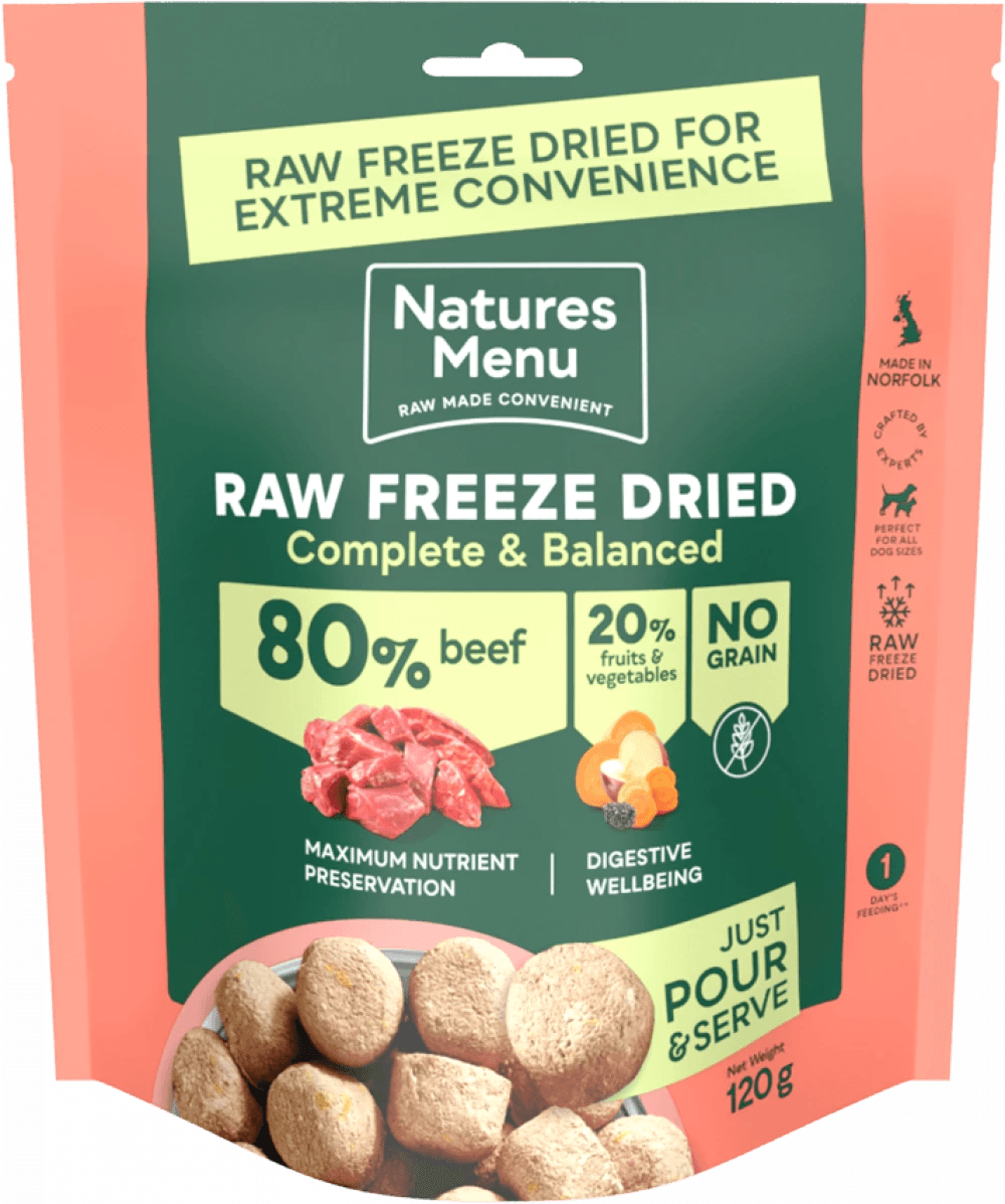 Delicious Complete and Balanced Freeze Dried dog food, made with 80% quality beef, combined with fruits, vegetables and superfoods. Perfect for adult dogs of all sizes. Our Freeze-Dried complete meals are designed to meet all of dog’s nutritional needs, helping support digestive wellbeing, without the need for frozen storage or defrosting.