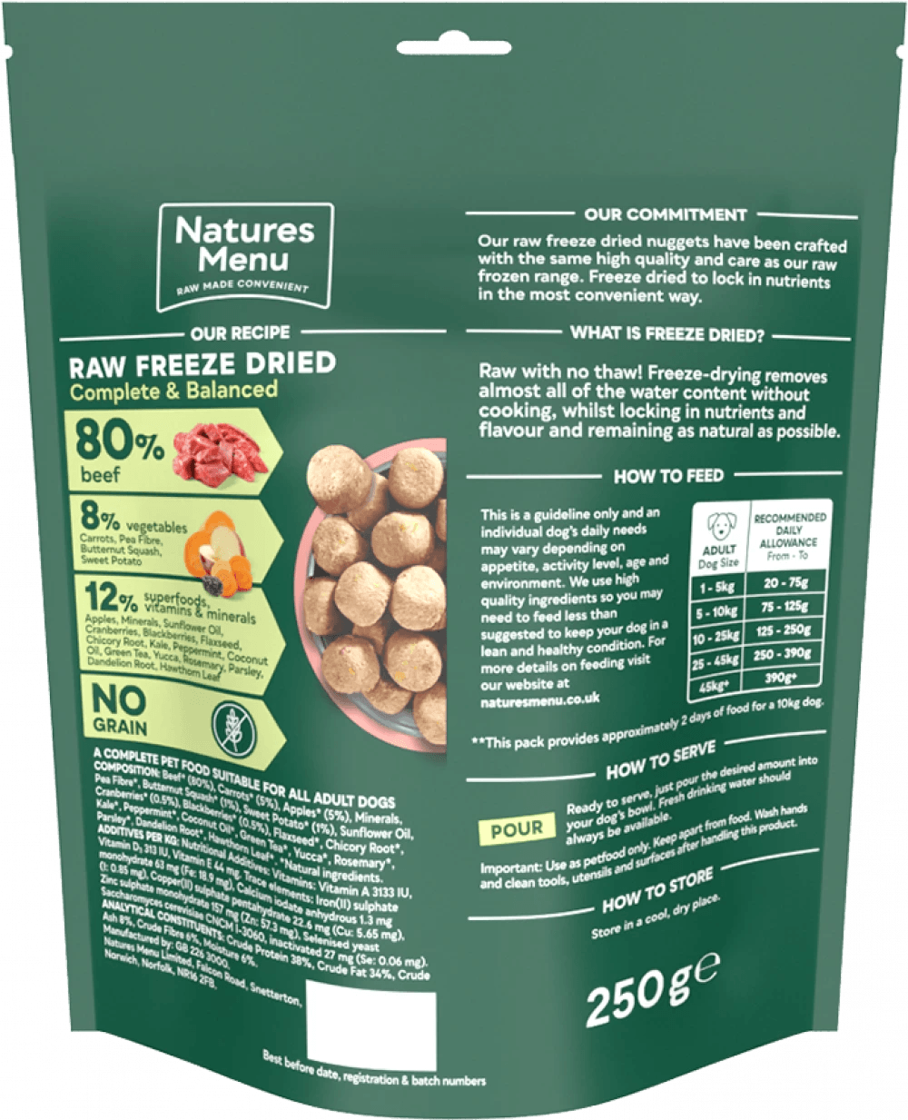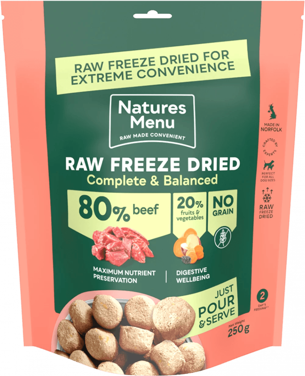 Delicious Complete and Balanced Freeze Dried dog food, made with 80% quality beef, combined with fruits, vegetables and superfoods. Perfect for adult dogs of all sizes. Our Freeze-Dried complete meals are designed to meet all of dog’s nutritional needs, helping support digestive wellbeing, without the need for frozen storage or defrosting.