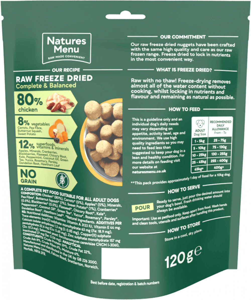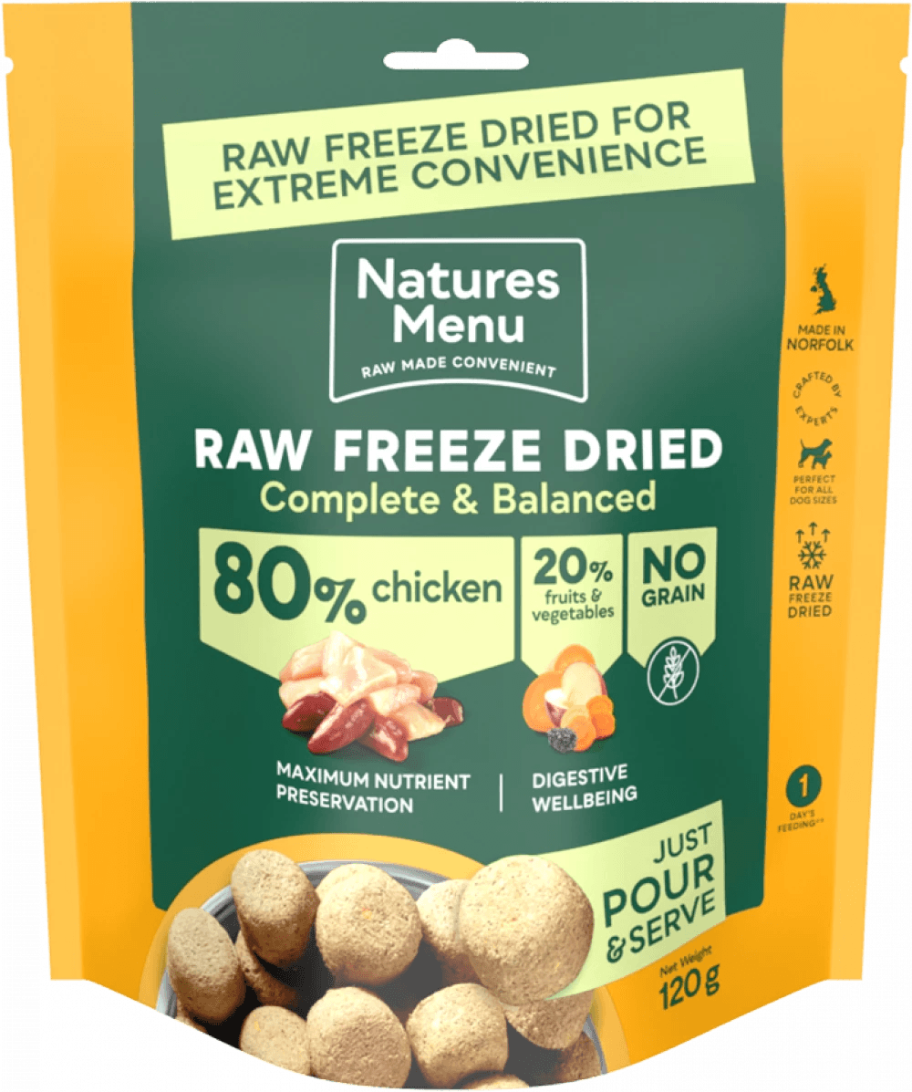 Delicious Complete and Balanced Freeze Dried dog food, made with 80% quality chicken, combined with fruits, vegetables and superfoods. Perfect for adult dogs of all sizes. Our Freeze-Dried complete meals are designed to meet all of dog’s nutritional needs, helping support digestive wellbeing, without the need for frozen storage or defrosting.