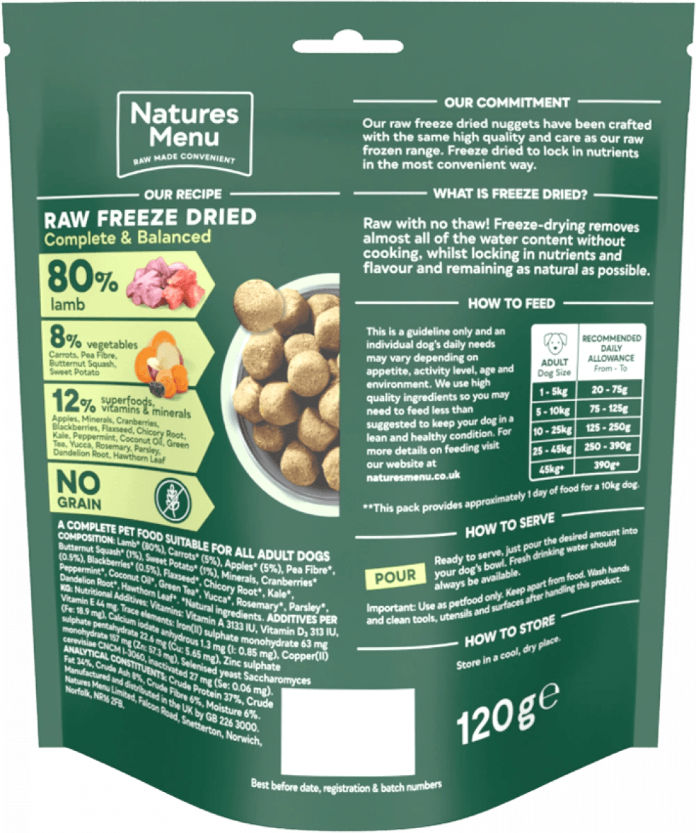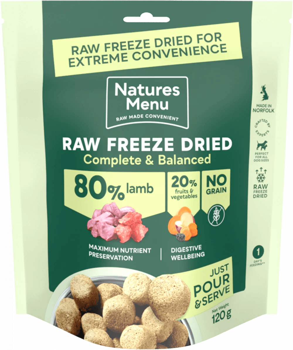 Delicious Complete and Balanced Freeze Dried dog food, made with 80% quality lamb, combined with fruits, vegetables and superfoods. Perfect for adult dogs of all sizes. Our Freeze-Dried complete meals are designed to meet all of dog’s nutritional needs, helping support digestive wellbeing, without the need for frozen storage or defrosting.