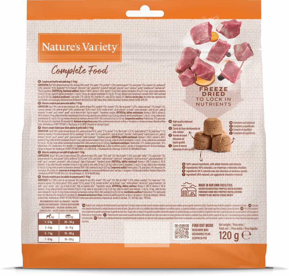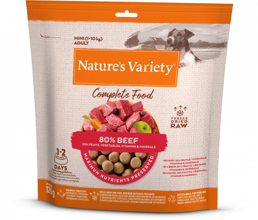The result is an incredibly nutritious meal that’s extra tasty, as the process intensifies the meaty flavours dogs love. Plus, with no artificial flavours, colours or preservatives, Nature’s Variety Freeze Dried can be enjoyed straight from the pack, with no refrigeration needed.