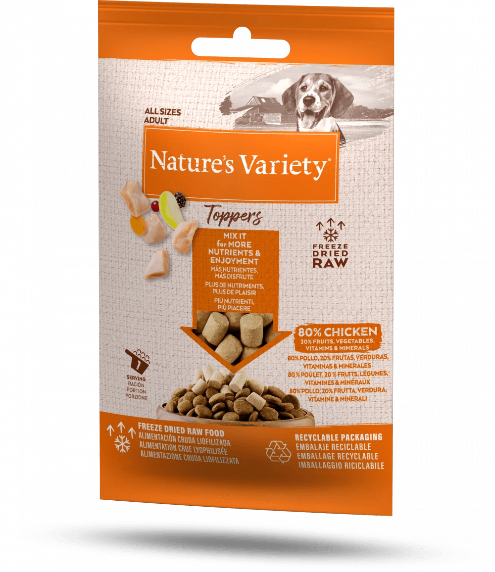 Nature’s Variety NEW Toppers are made from 80% premium quality Chicken and will give your dog’s meal a boost of enjoyment & nutrients.