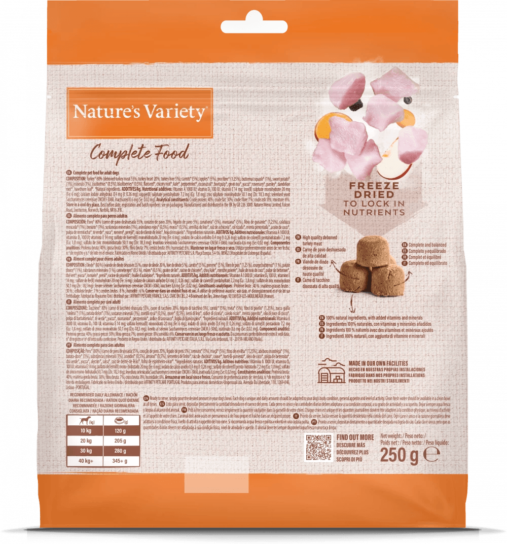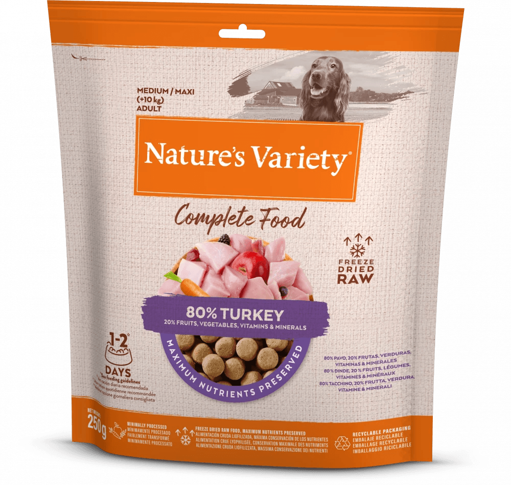 Nature's Variety Complete Freeze Dried Food is made with quality, deboned Turkey meat as the main ingredient which is blended with a special selection of powerfully nutritious fruits, vegetables and botanicals. Formed into bite-sized nuggets, these raw ingredients are then freeze-dried.