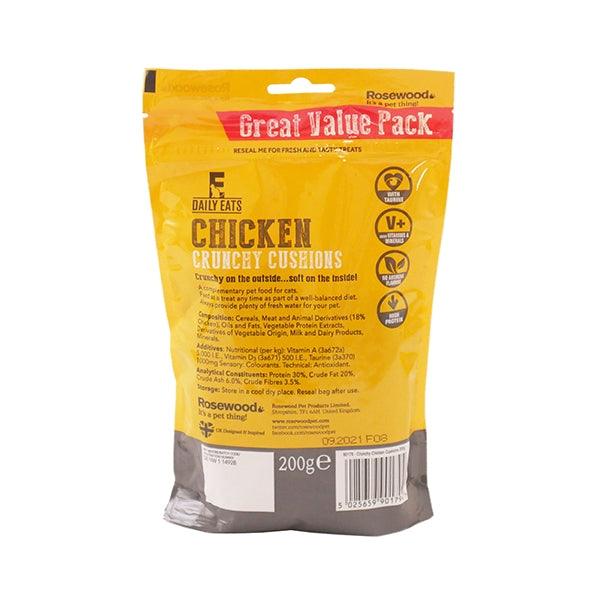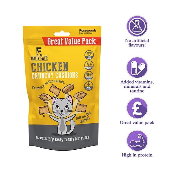 Crunchy on the outside with a creamy centre. Scrumptious treats with added vitamins & Minerals. Contains absolutely no artificial flavours, which is fantastic for your cats digestion.Great Value Pack! Composition:Cereals, Meat and Animal Derivatives (18% Chicken), Oils and Fats, Vegetable Protein Extracts, Derivatives of Vegetable Origin, Milk and Dairy Products. Additives: Nutritional (per kg): Vitamin A (E672) 5000 I.E.,Vitamin D3 (E671) 500 I.E., Taurine 1000mg. Sensory: Colourants. Technical: Antioxidant. Typical Analysis:Protein 30%, Crude Fat 20%, Crude Ash 5.0%, Crude Fibre 3.5%.
