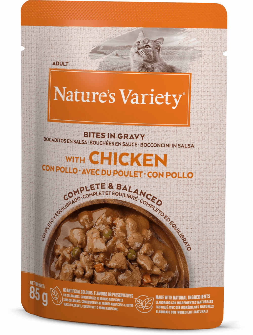 Complete and balanced wet food with high quality natural ingredients with chicken steamed in their own juice to preserve nutrients.