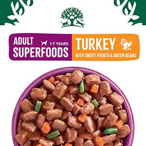 NATURAL INGREDIENTS dog food with a blend of sweet potato and green beans, sources of antioxidants