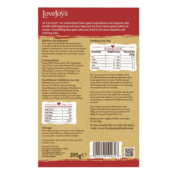 Lovejoys Original wet food is a hypoallergenic complete pet food for adult dogs.Lovejoys Original Adult Turkey, Rice & Veg is made with top quality ingredients which have been carefully selected for their health benefits. Lovejoys includes Seaweed Oil. Our seaweed is sustainable and renewable, making it environmentally friendly too.This recipe is hypoallergenic which means it is made without ingredients which are known allergens, such as pork, wheat, gluten, dairy, soya and beef. This food can be fed in conjunction with the Lovejoys Original Dry Food Range.