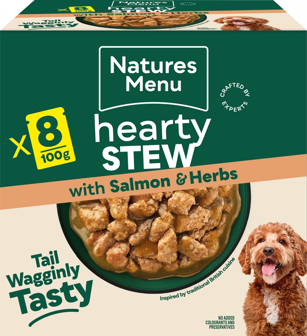 Salmon and herbs – a classic British dish. Your dog will love our hearty stew made with succulent chunks in a delectable gravy, with no added colours and preservatives. It’s tail-waggingly tasty!