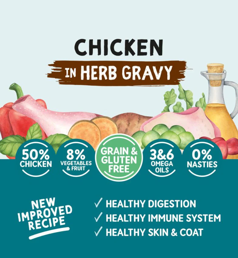 We are confident your dog will love our delicious Herb Gravy recipe with 50% Chicken, a highly digestible and rich source of essential amino acids, B vitamins, and minerals.