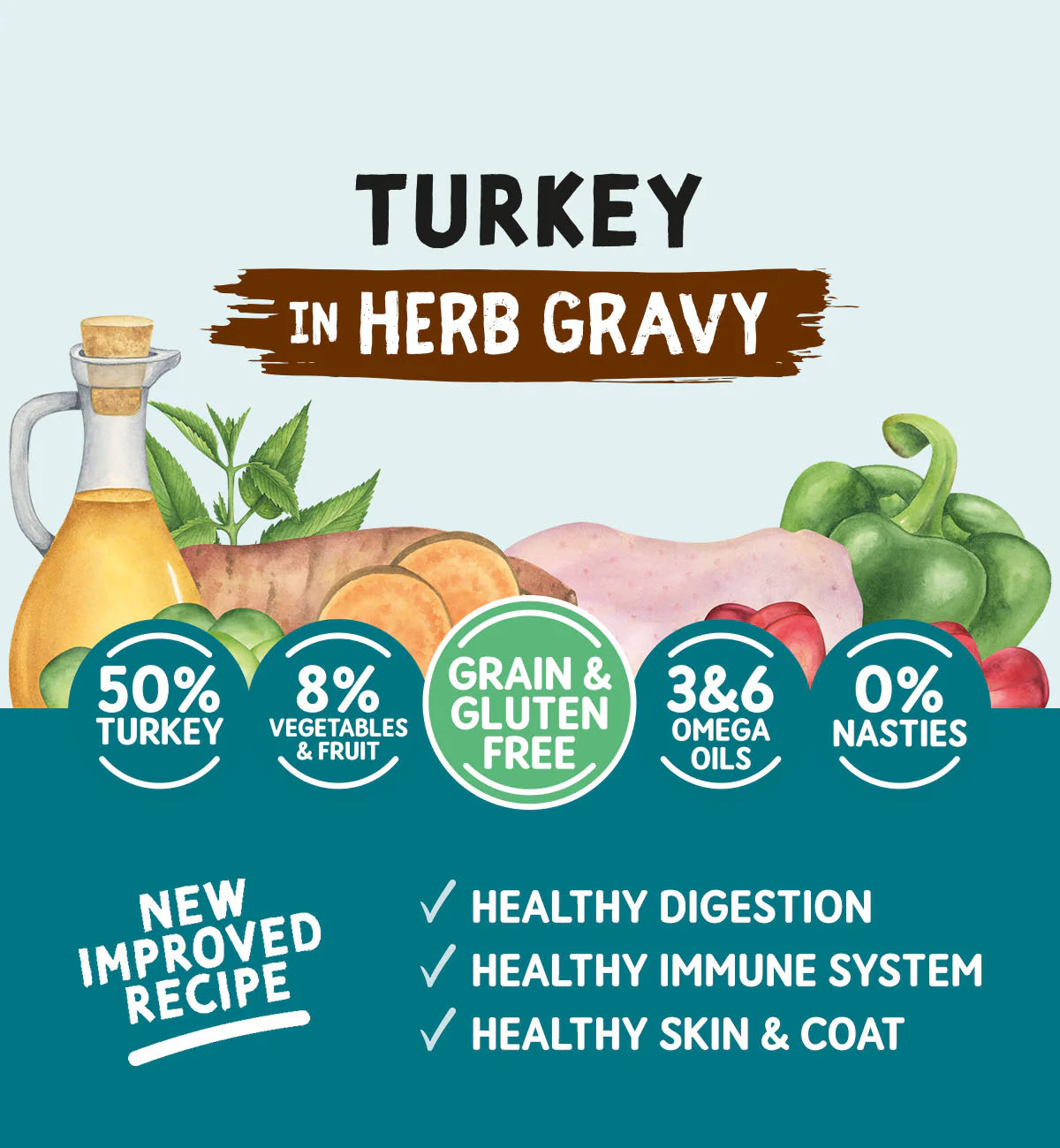 We are confident your dog will love our delicious Herb Gravy recipe with 50% Turkey, a highly digestible and rich source of essential amino acids, B vitamins, and minerals.