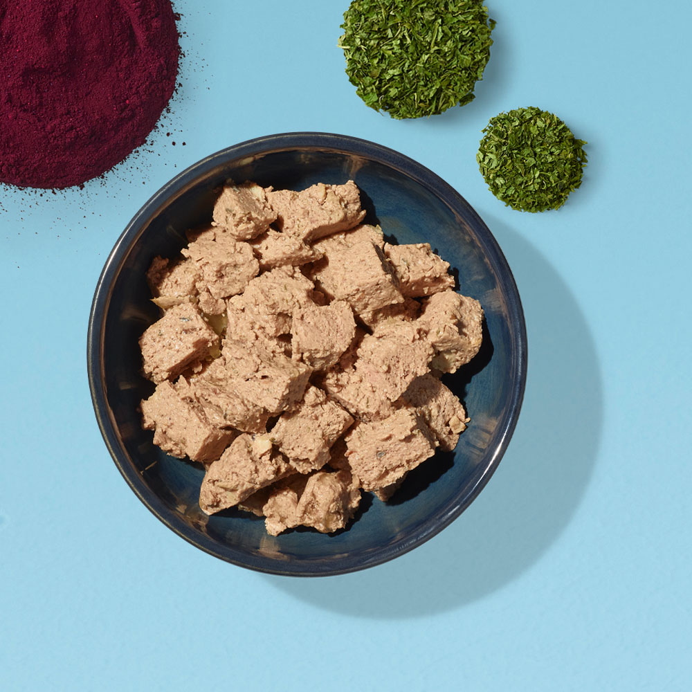Chicken* 65%, Minerals, Salmon Oil* 0.3%, Parsley, Yeast Cell Walls 0.033% (as a source of MOS and Beta glucans), Chicory Roots Powder 0.033% (as a source of FOS), Glucosamine Hydrochloride 0.01%, Tyndallised Lactobacillus helveticus* 0.002%, Tyndallised Lacticaseibacillus paracasei* 0.002%, Chondroitin Sulphate 0.002%. *Natural ingredients *Paraprobiotics