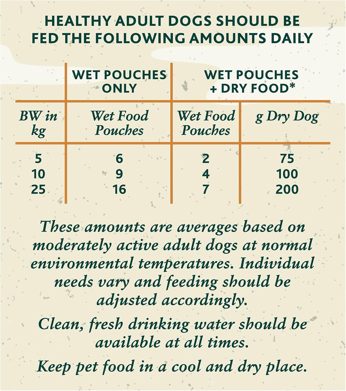 Wet Pouches + Dry Food*: 5kg - 2 pouches + 75g of dry; 10kg - 4 pouches + 102g of dry; 25kg - 7 pouches + 197g of dry.