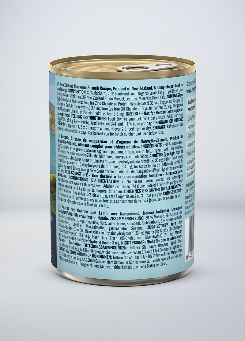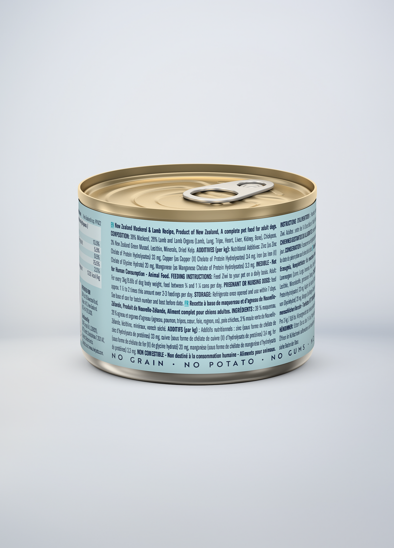 Mackerel, Water Sufficient for Processing, Lamb, Lamb Lung, Chickpeas, Lamb Tripe, Lamb Heart, Lamb Kidney, Lamb Liver, New Zealand Green Mussel, Lamb Bone, Lecithin, Minerals (Dipotassium Phosphate, Magnesium Sulfate, Zinc Amino Acid Complex, Copper Amino Acid Complex, Selenium Yeast, Manganese Amino Acid Complex), Dried Kelp, Salt, Vitamins (Vitamin E Supplement, Thiamine Mononitrate, Vitamin B5 Supplement, Vitamin D3 Supplement, Folic Acid).