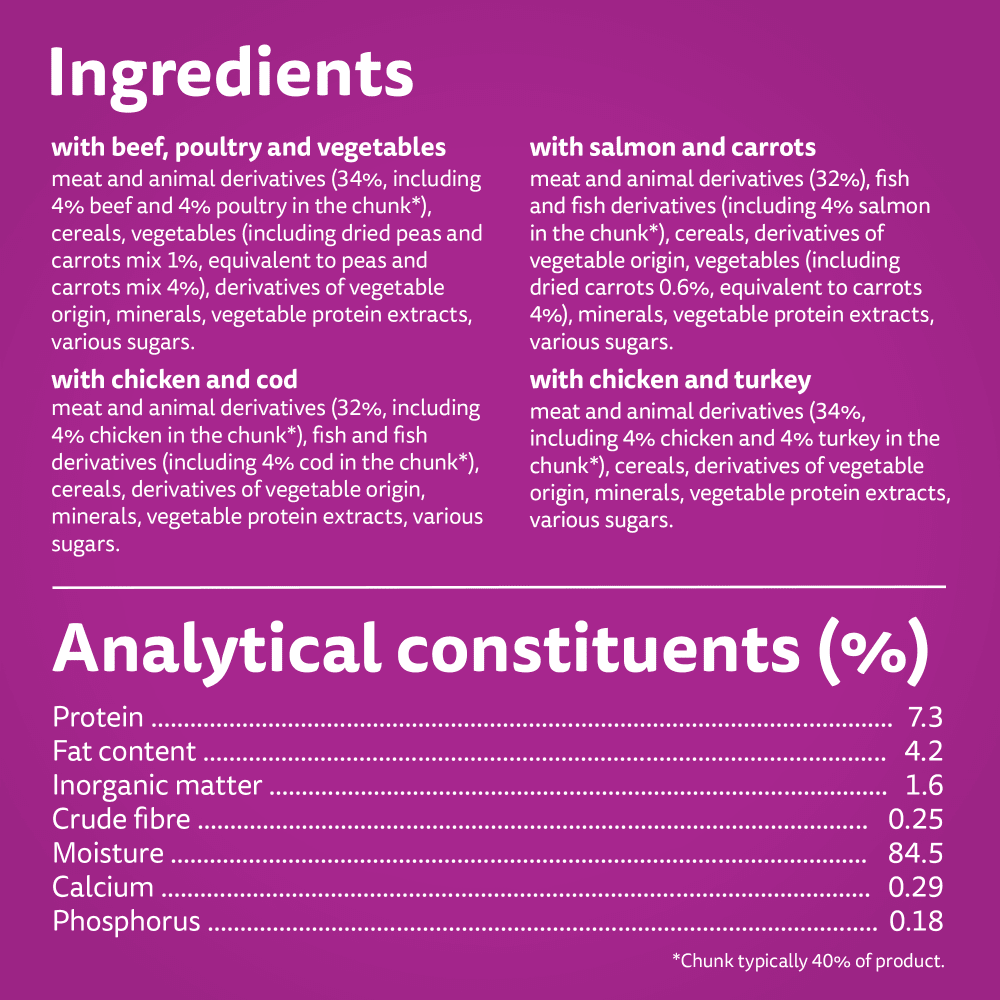 Wet cat food with delicious flavour sensations combining proteins and vegetables in a delightful mix guaranteed to make your cat purr.