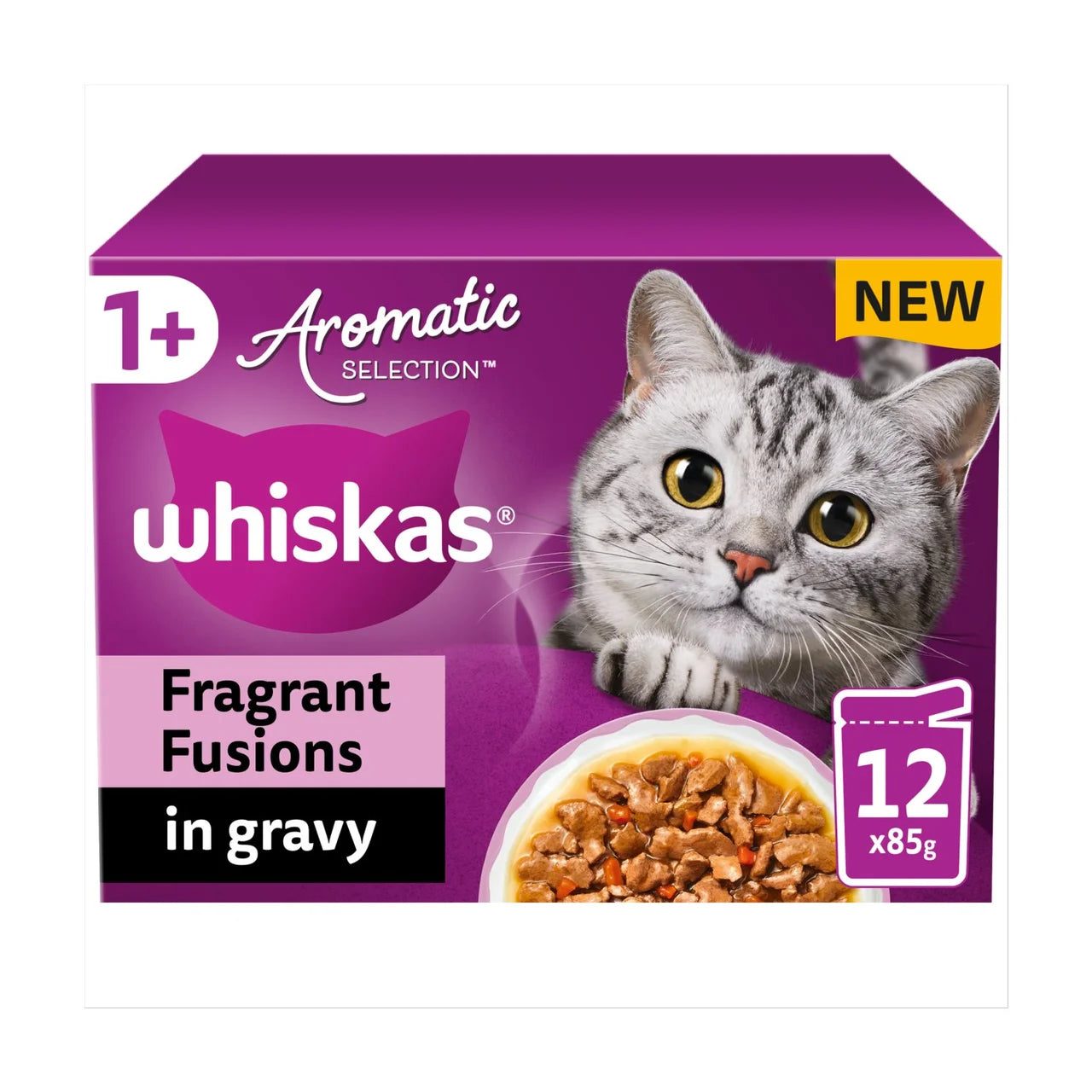 WHISKAS AROMATIC SELECTION Fragrant Fusions wet food pouches, unlock a world of purrfect aromatic meals for your 1+ adult cats. Where specially selected ingredients are infused with aromas proven to delight the feline senses. Served with a generous topping of flavoursome gravy, each meal tastes just as good as it smells.