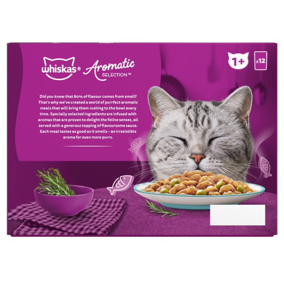 WHISKAS AROMATIC SELECTION Seafood Delight wet food pouches, unlock a world of purrfect aromatic meals for your 1+ adult cats. Where specially selected ingredients are infused with aromas proven to delight the feline senses. Served with a generous topping of flavoursome gravy, each meal tastes just as good as it smells.