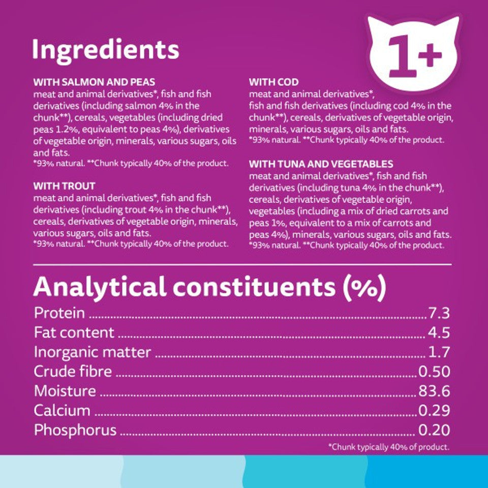 Each delicious recipe has an irresistible aroma for even more purrs Made with 100% high quality ingredients and formulated to provide 100% of your cat's daily needs. With B vitamins and balanced minerals to help keep your cat healthy. No added artificial colours and preservatives. To reduce our environmental impact, fish in our recipes is responsibly sourced.