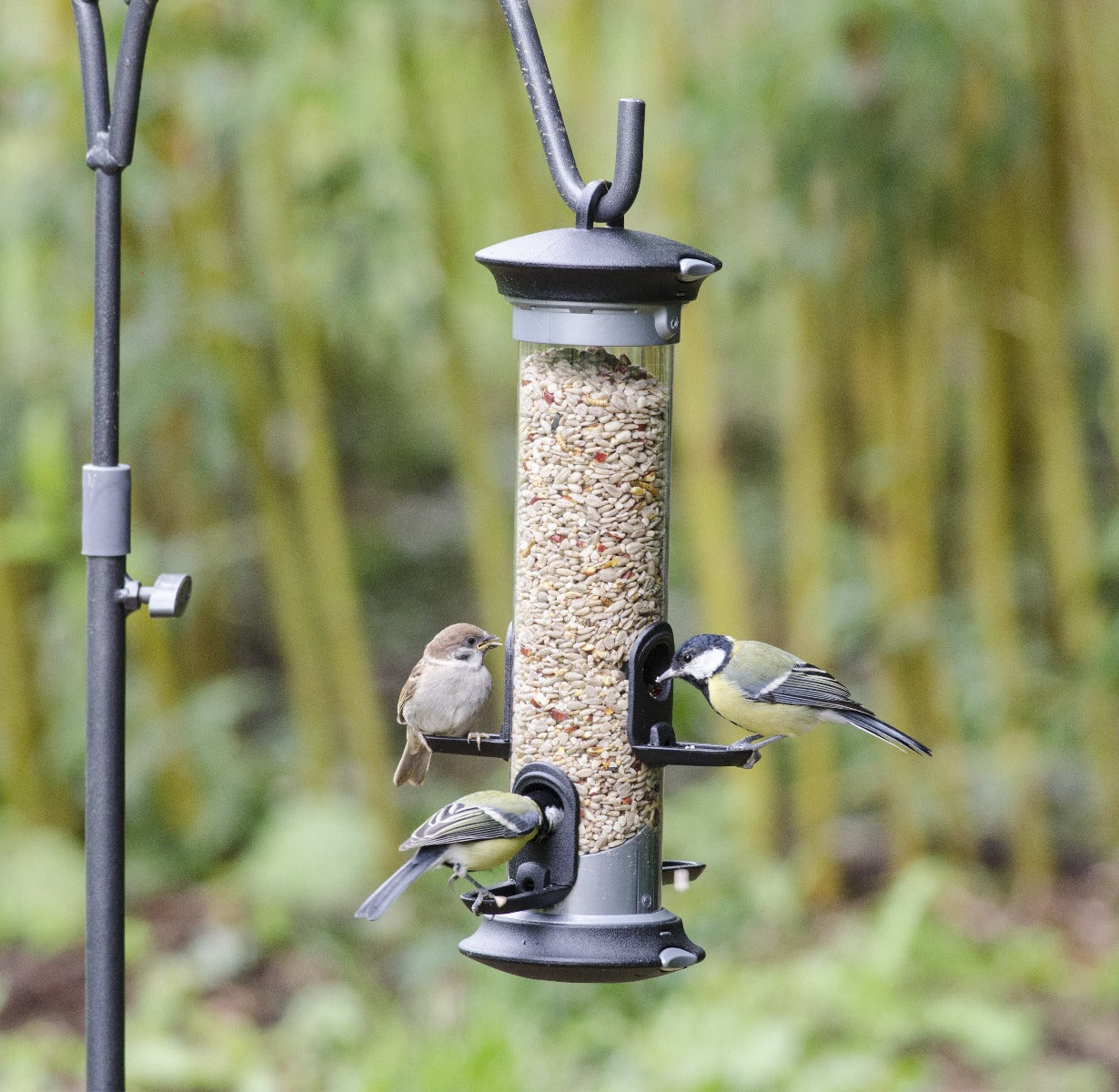 The Apollo feeder has four feeding ports, so multiple birds can use this feeder at the same time. The ports are designed to ensure that birds have maximum access to the food on offer. The off-set spacing of the ports also provides each bird with a clear feeding area which results in more hygienic feeding. The feeder also features the simple but highly effective perching rings, these rings ensure birds can feed in their natural feeding position - facing forward. CJ Wildlife were the first company to create the perching ring for seed feeders as it was recognised that enabling birds to feed in their natural feeding position. Feeding in the position allows the birds to be able to look out for predators which increases their confidence, thus resulting in them being able to remain at the feeder for longer.