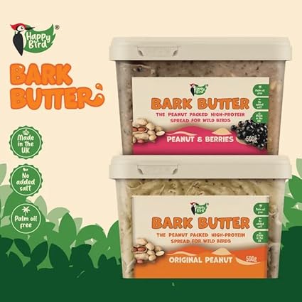Give your garden birds a nutritious boost with Happy Bird Bark Butter Peanut Spread! Packed with protein-rich peanuts, this high-energy food is perfect for attracting woodpeckers, blue tits, robins, and more. It’s palm oil-free, contains no added salt, and is safe for year-round feeding. Simply spread onto tree bark or use with the Happy Bird Bark Butter Feeder for a mess-free feeding experience. Whether it’s winter survival or summer sustenance, this natural bird food helps keep your feathered visitors healthy and active. Proudly made in the UK.