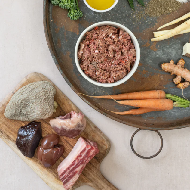 Human Grade British Ingredients: Beef with bone, Green Lambs Tripe, Liver, Kidney, Heart, Broccoli, Carrot, Swede, Flaxseed Oil, Kelp, Celery Seeds, Alfalfa, Nettles, Psyllium Husks, Clivers and Wild Yam.