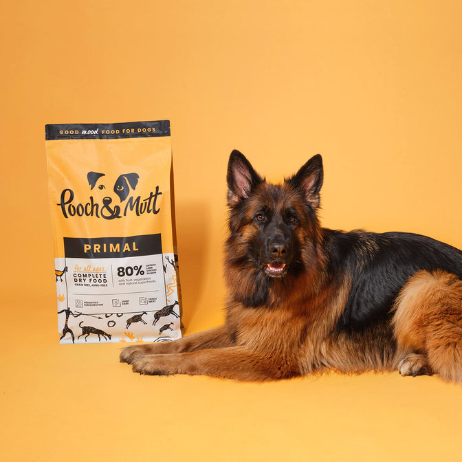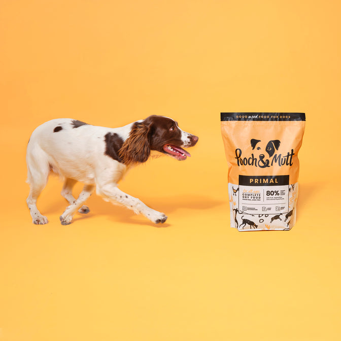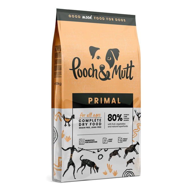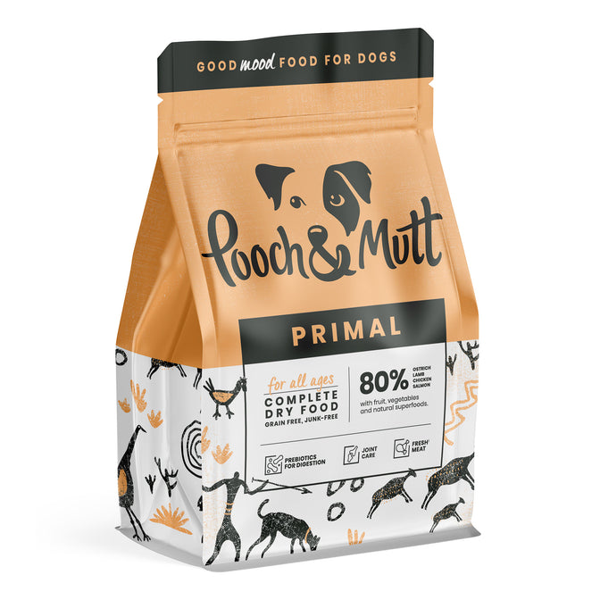 PRIMAL dry dog food replicates the ancestral diet of dogs, providing the highest nutritional value from natural ingredients hunted or foraged in the wild. 80% meat from lamb, ostrich, chicken and salmon, PRIMAL is high in animal protein, providing energy and amino acids for muscle maintenance. Alongside a host of vegetables including carrots and pumpkin, PRIMAL has been boosted with natural superfoods Turmeric and Spirulina, to provide powerful anti-inflammatory and antioxidant effects for optimal health. Especially beneficial for active or working dogs, this recipe contains glucosamine and chondroitin to protect against wear and tear and maintain joint health.
