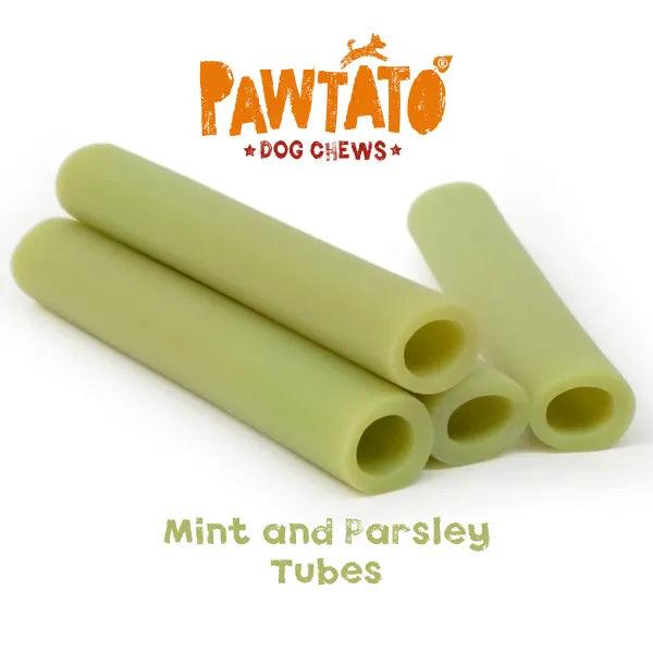 Benevo Pawtato Tubes with Mint & Parsley are low fat dog chews made from organically grown sweet potato, blended with gm-free rice, refreshing mint and breath freshening parsley.