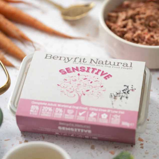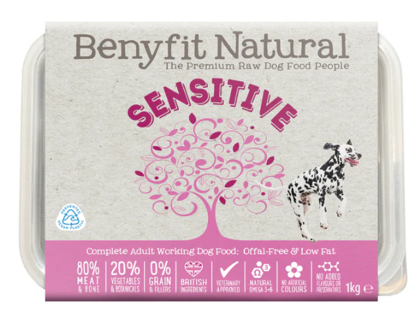 Premium raw dog food lovingly prepared by Benyfit Natural. A truly satisfying and healthy meal to assist sensitive stomachs, those with pancreatitis or prone to forming bladder stones as it contains no offal, is low in purine and low fat (so also great for overweight working dogs).