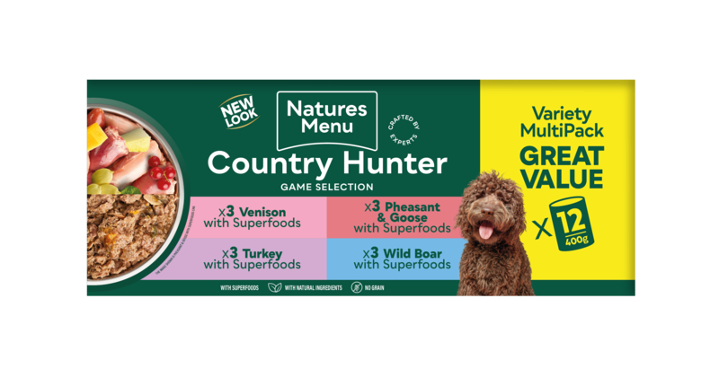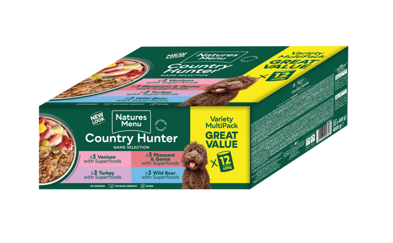 Our Country Hunter Game Meat Selection Cans are seriously meaty, made with Pheasant & Goose, Duck & Turkey, Wild Venison or Wild Boar, blended with high quality fruit, veg and superfoods. All gently cooked within the can to retain the goodness and flavour your dog will love. Grain Free. Complete and balanced. Pack size: 12x400g