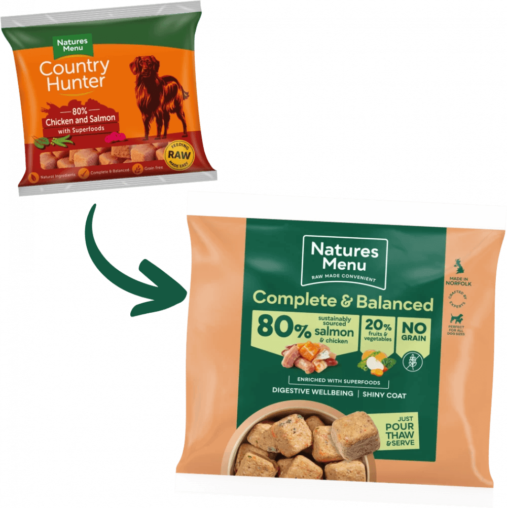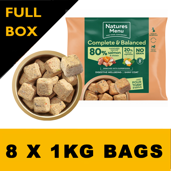 A meaty complete and balanced meal. Tender chicken salmon dog food enriched with a delicious blend of superfoods. No grain. Pack size 1kg.