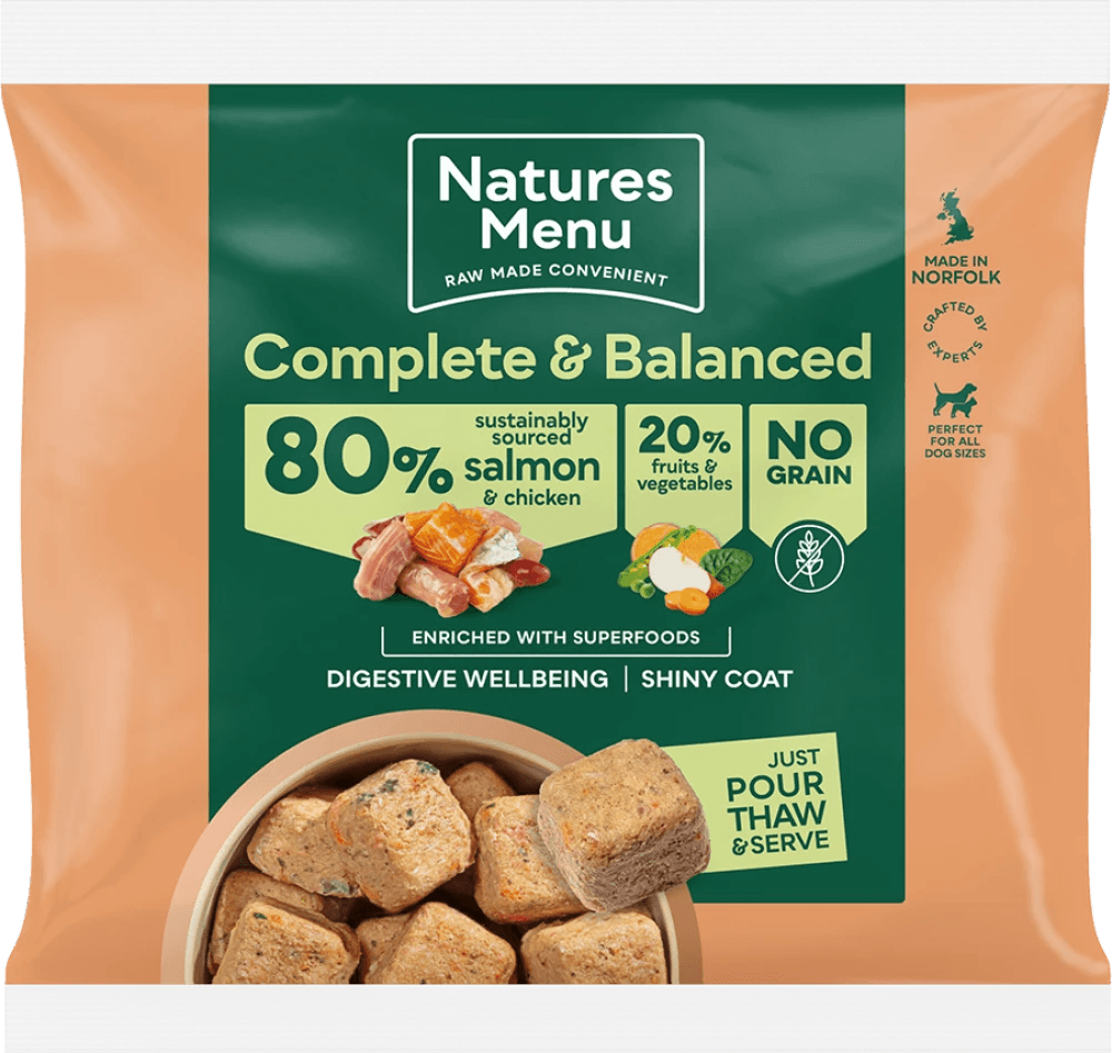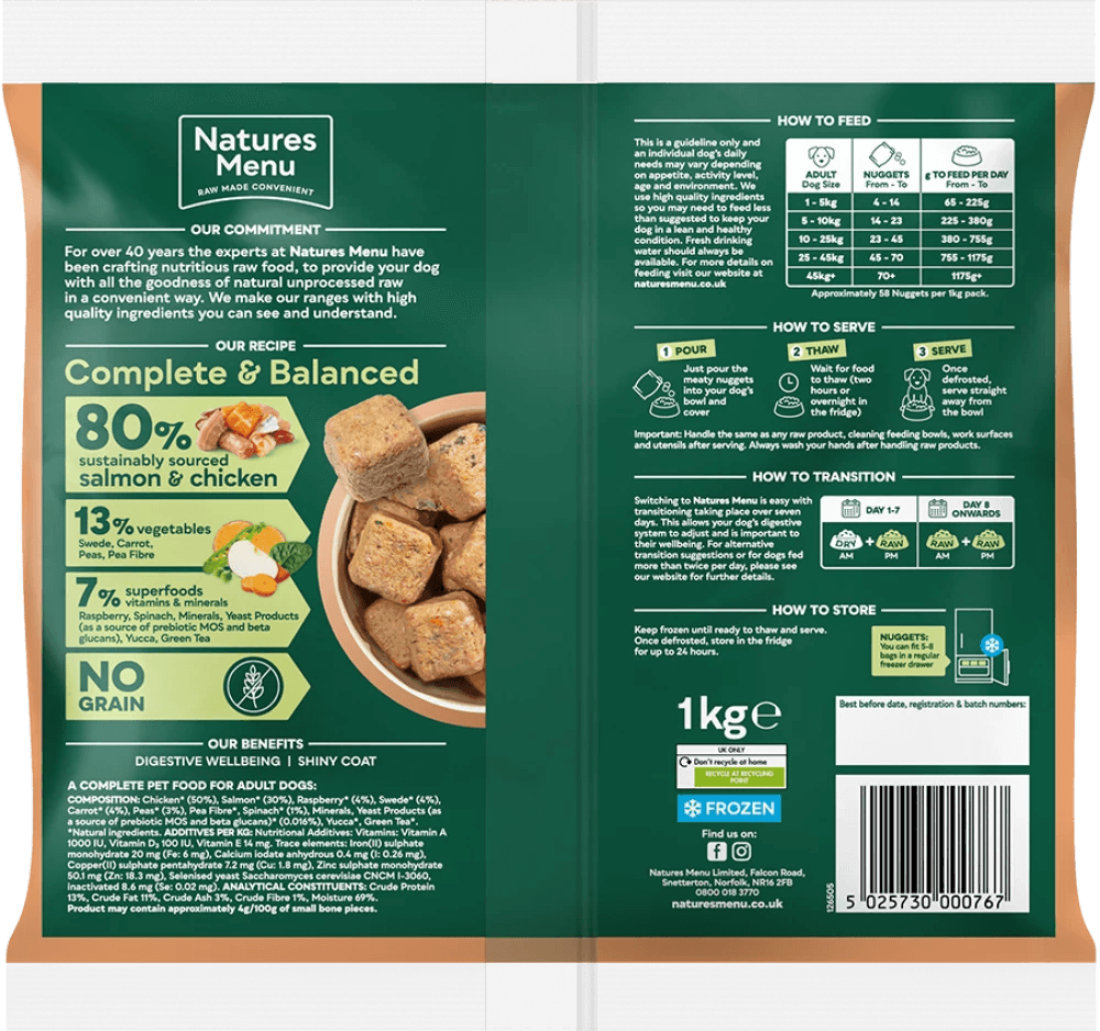 These chicken salmon dog food nuggets are made using a no grain recipe and proven to support healthy digestion and beautiful shiny coats - who wouldn't want that for their best friend? From our home in Norfolk these delicious recipes are crafted by our in-house experts. Plus we're very proud of the ingredients that we use, ingredients you can see, understand and trust. These chicken and salmon nuggets may include some small bone pieces (we estimate a maximum of 4g in every 100g) and are suitable for all adult dogs.