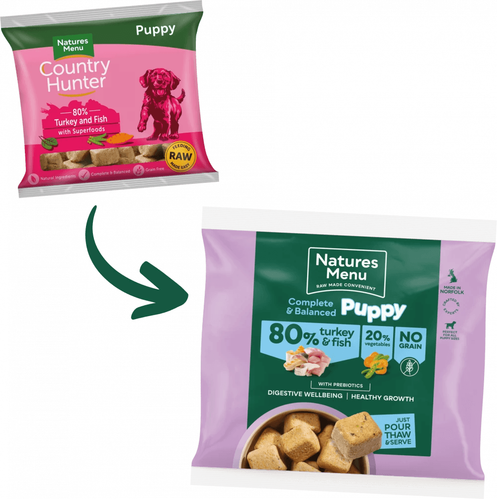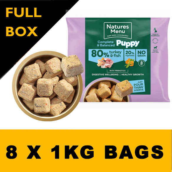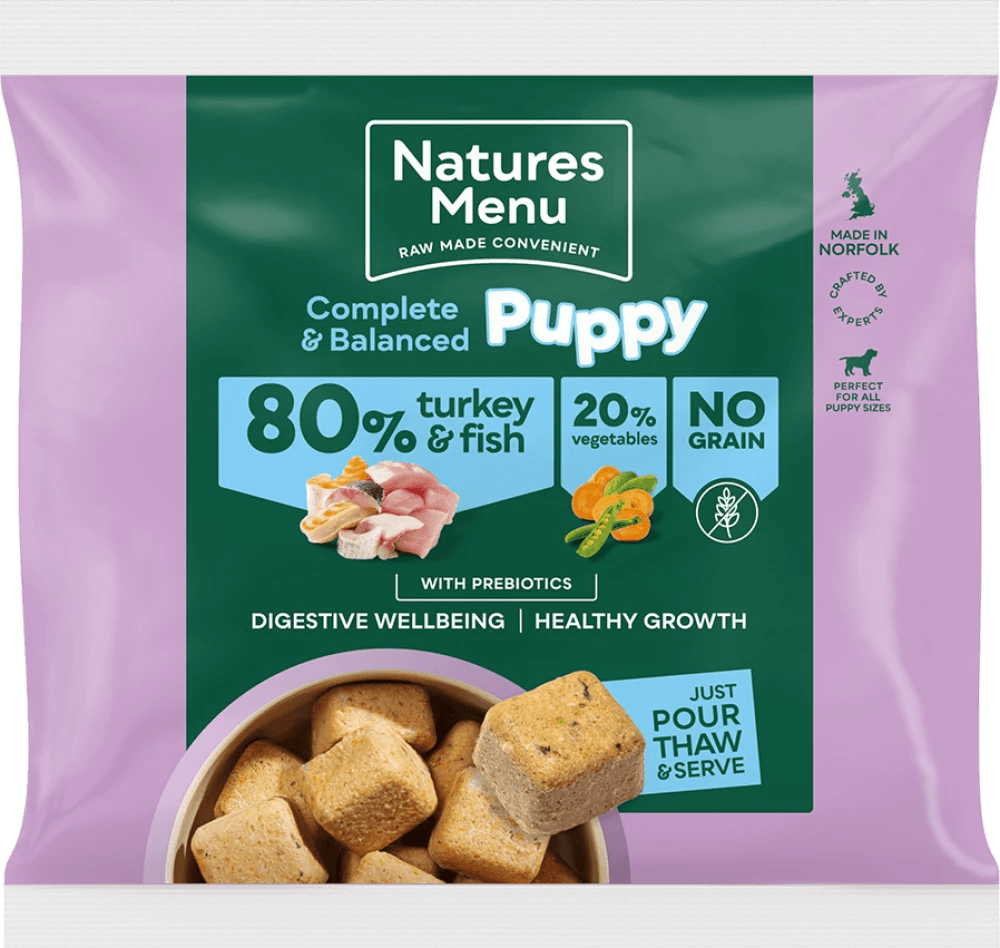 Natures Menu turkey and fish puppy food is crafted by our trusted experts to ensure complete and balanced recipes every time. No artificial colours or preservatives either.