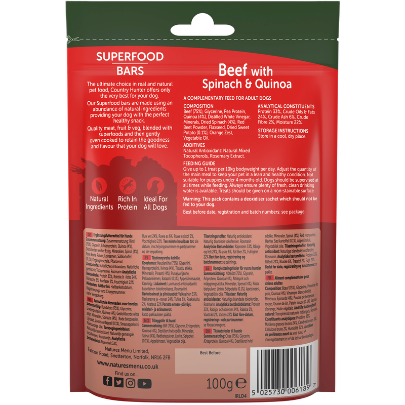 Nutritious air-dried Superfood bars made with the finest cuts of beef and a natural blend of spinach and quinoa. Complemented with extra fruits, vegetables and superfoods for a perfect healthy snack.